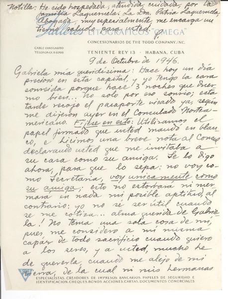 [Carta] 1946 oct. 9, [La Habana, Cuba] [a] Gabriela Mistral [manuscrito] Petrona Noda.