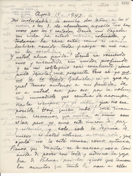[Carta] [1947], [Finca de La Yaya, Barreto, Provincia de Matanzas, Cuba] [a] Gabriela [Mistral] [manuscrito] Petrona [Noda].