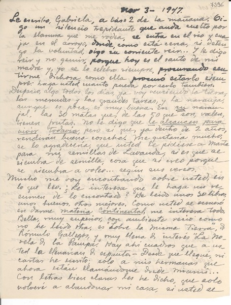 [Carta] 1947 nov. 15, [California, Estados Unidos] [a] Gabriela [Mistral] [manuscrito] Manuel Pedro González.