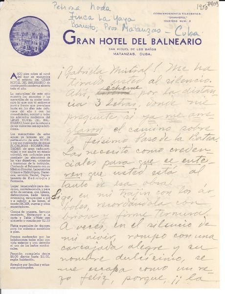 [Carta] [1946, La Habana, Cuba] [a] Gabriela Mistral [manuscrito] Eduardo Tello.