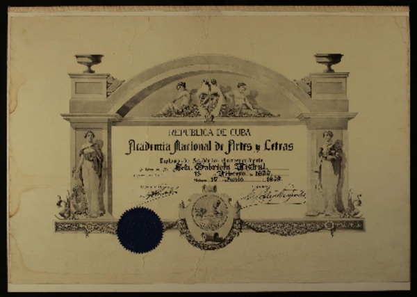 [Diploma] 1939 feb. 13, La Habana, Cuba [a] Gabriela Mistral [manuscrito] Academia Nacional de Artes y Letras