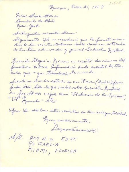 [Carta] 1957 ene. 21 Miami, Florida [a] Doris Dana, [New york] [manuscrito] Lázara Farancos.