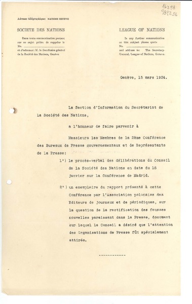 [Carta] 1934 mars 15, Genève, [Suisse] [a] [Gabriela Mistral] [manuscrito] Societe des Nations.