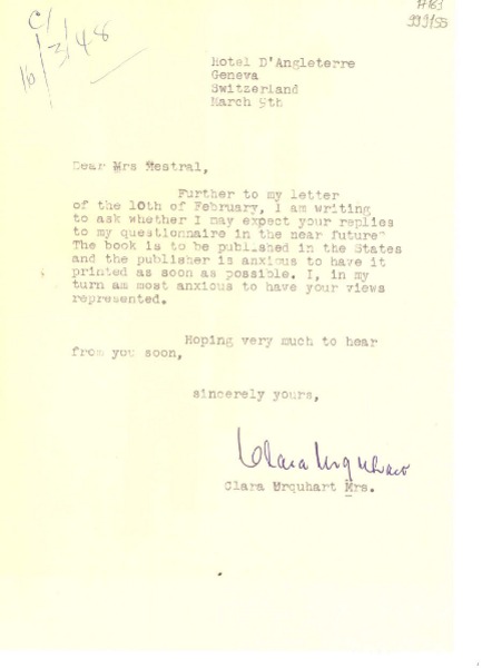[Carta] 1948 Mar. 9, Geneva, Switzerland [a] Dear Mrs. Mestral [manuscrito] Clara Urquhart.