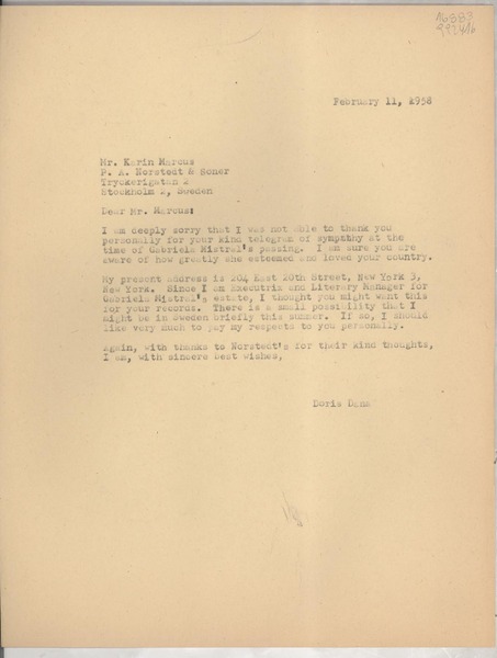 [Carta] 1950 June 20, Aktiebolaget P. A. Norstedt & Soner, Tryckerigatan 2, Stockholm 2, [Sweden] [a] Miss Doris Dana, co Miss Gabriela Mistral, Apartado 21, Jalapa, Veracruz, Mexico [manuscrito] / Karin Marcus.