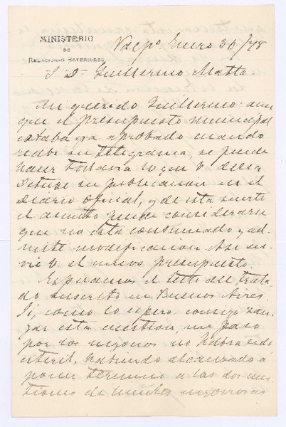 [Carta], 1878 ene. 30 Valparaíso, Chile <a> Guillermo Matta