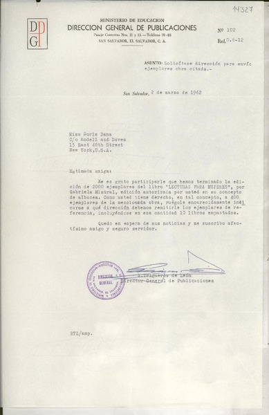 [Carta] 1963 abr. 8, Nueva York, [Estados Unidos] [a] Sr. Don R. Trigueros de León, Director General de Publicaciones, Ministerio de Educación, San Salvador, El Salvador [manuscrito] Doris Dana.