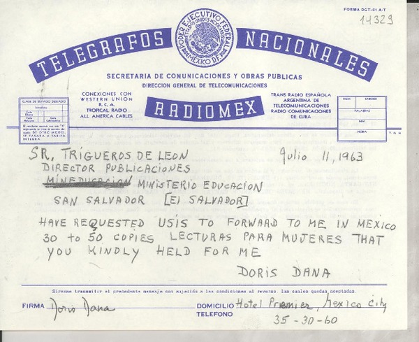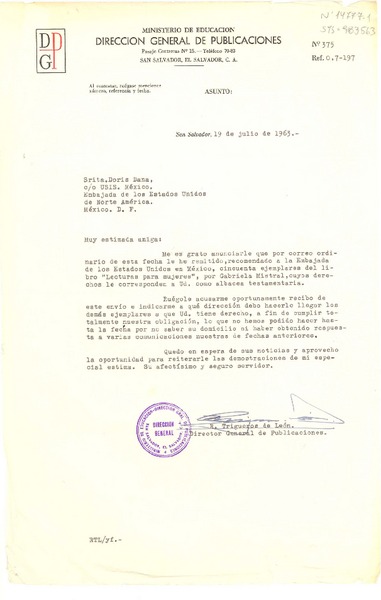 [Carta] 1963 jul. 19, San Salvador, [El Salvador] [a] Doris Dana, Embajada de los Estados Unidos de Norte América, México D.F. [manuscrito] N. Trigueros de León, Director General de Publicaciones.