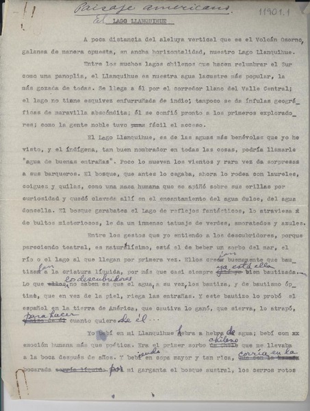 Paisaje americano : El Lago Llanquihue [manuscrito] Gabriela Mistral.