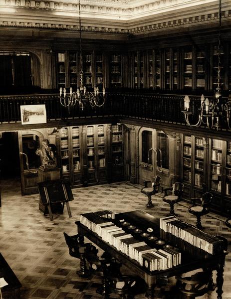 [Vista interior de la Biblioteca Americana Barros Arana, Sala Medina, Biblioteca Nacional: espacio revestido en madera de nogal, Anaqueles con puerta de vidrio, parquet de maderas nobles, lámparas de techo en bronce, de 8 brazos con bombillas como velas, balconada en el segundo piso, busto de Barros Arana] [fotografía].