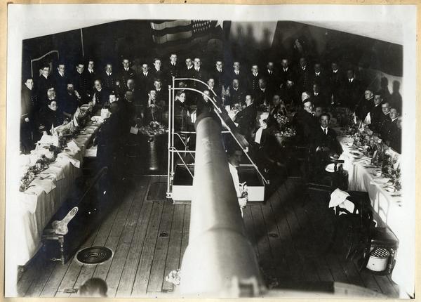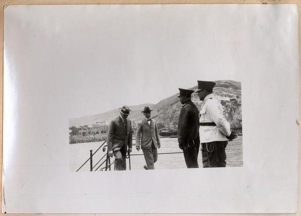 [Almirante Lattimer y jefes del Rochester con el secretario del administrador del J. C. de A. La Paz que se dirigen a Bolivia, donde nuestro gobierno puso a su disposición un tren especial, el cuál batió el récord mundial de velocidad] [fotografía].