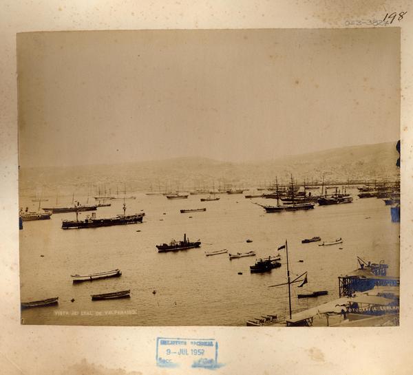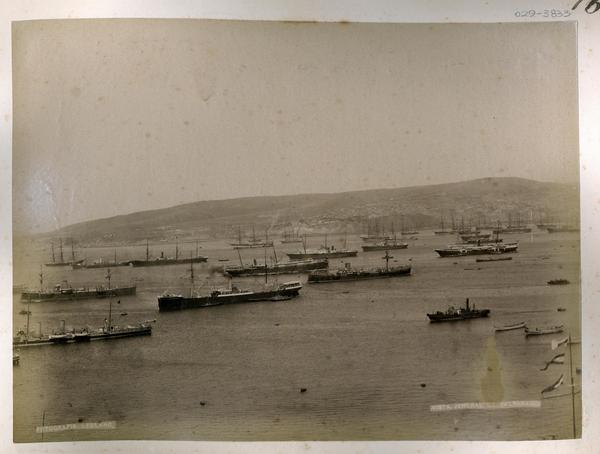 [Vista general de la bahía de Valparaíso, con barcos en el mar] [fotografía] Fotografía Leblanc.