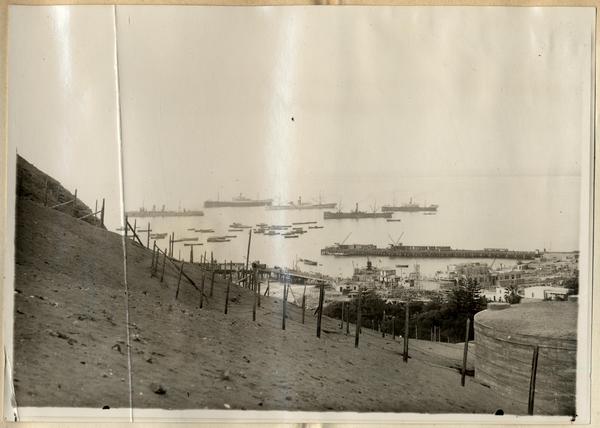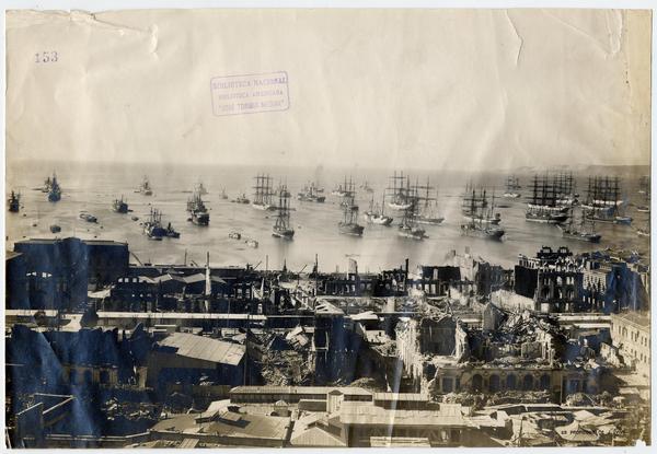 [Vista panorámica de la bahía de Valparaíso después del terremoto en 1906, se observan edificios destruídos, y barcos en el mar] [fotografía].
