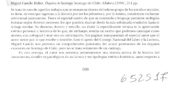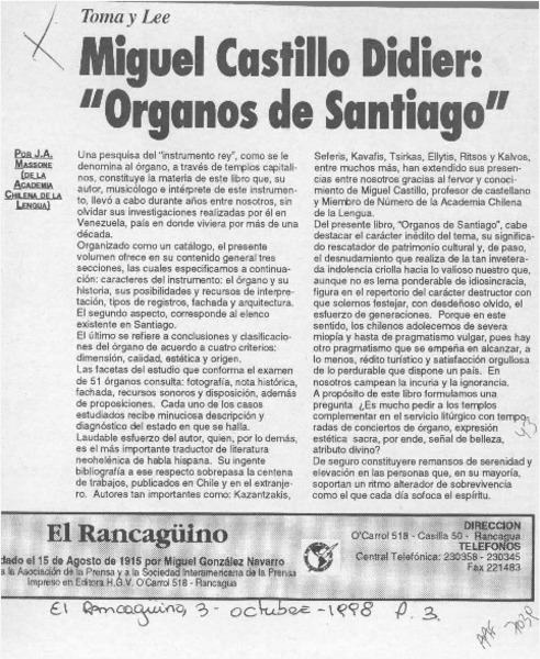 Miguel Castillo Didier, "Organos de Santiago" [artículo] J. A. Massone.