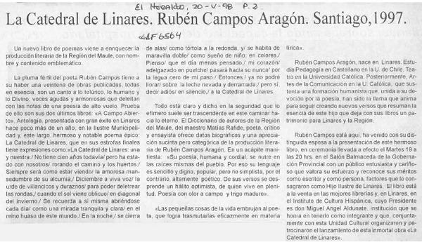 Rubén Campos Aragón y "La catedral de Linares" [artículo] Enrique Gómez Muñoz.
