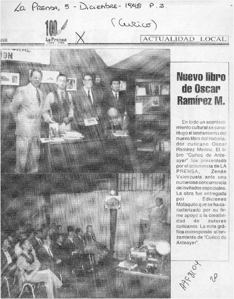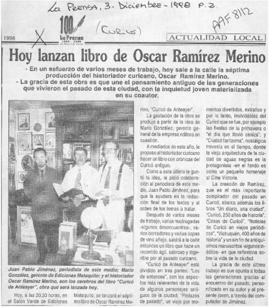 Hoy lanzan libro de Oscar Ramírez Merino [artículo].
