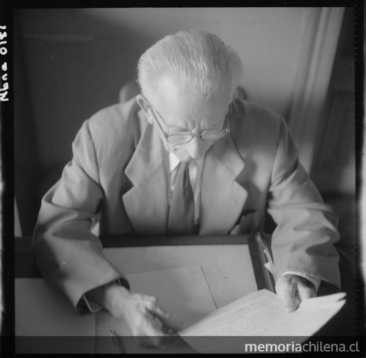 Joaquín Edwards Bello revisando sus escritos. 1 fotografía:Fotografía blanco y negro
