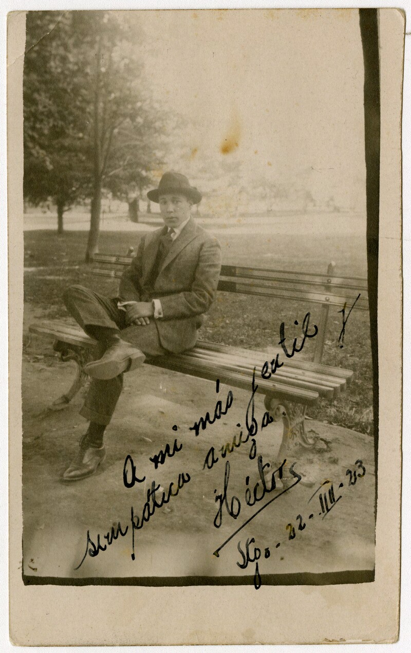 [Hombre ][Héctor] con sombrero sentado en una banca en un parque [Quinta Normal] [fotografía].