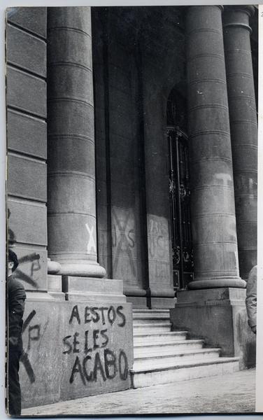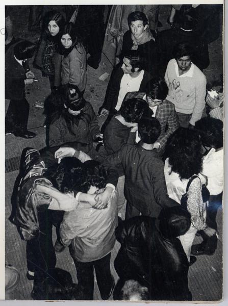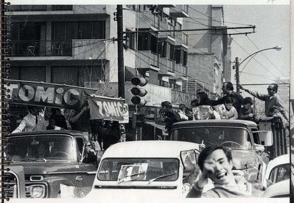 [Universitarios en el frontis de la Fech celebrando con el puño izquierdo en alto el triunfo de Salvador Allende] [fotografía]Enrique Paublo.