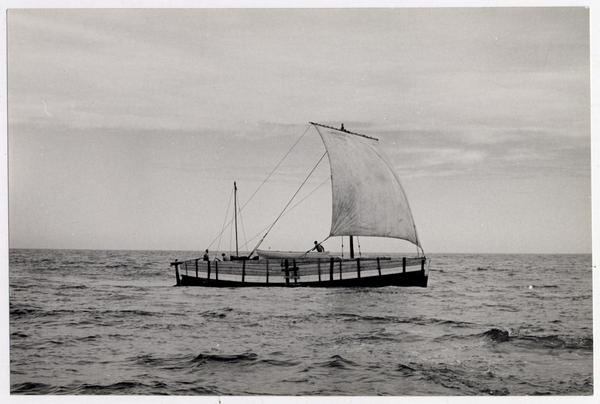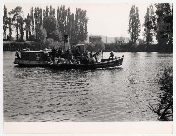 [Trabajadores del astillero a bordo de un falucho en el río Maule] [fotografía] Domingo Ulloa.