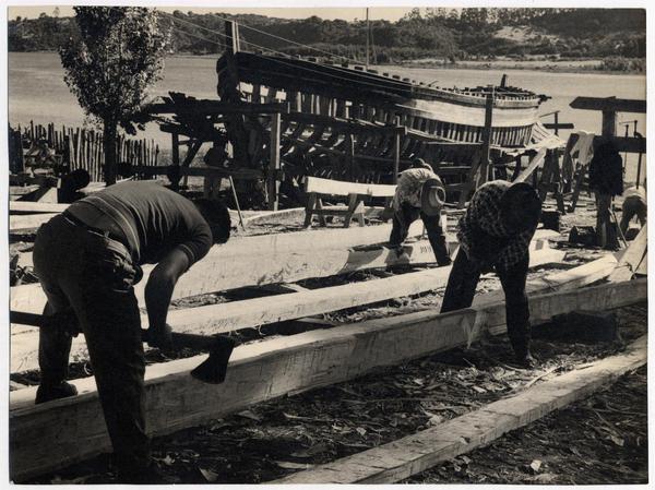 Astilleros del Maule: Aquí trabajan obreros de todas las edades cortando cuadernas [fotografía] Domingo Ulloa.