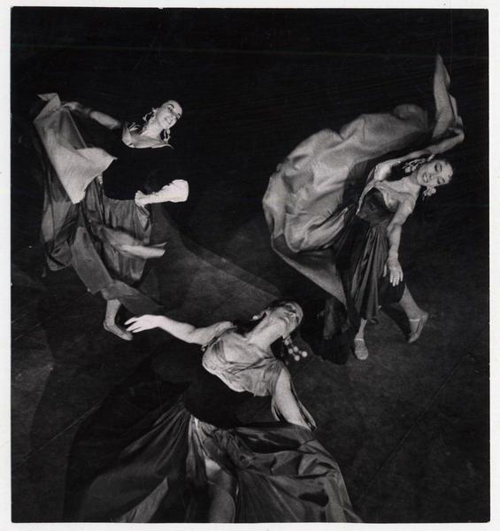 Bailarín Oscar Escauriaza [junto a Graciela Gilberto y Elly Griebe] en una presentación del ballet "Alotria" [fotografía] Domingo Ulloa.
