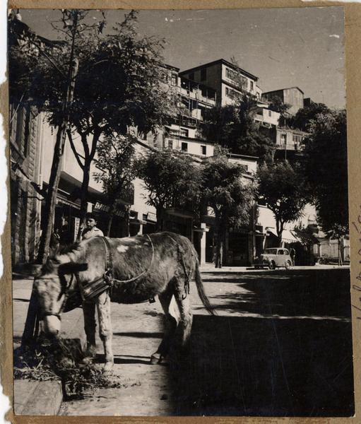 [Asno junto a un árbol, come en la acera en una calle de Valparaíso] [fotografía]