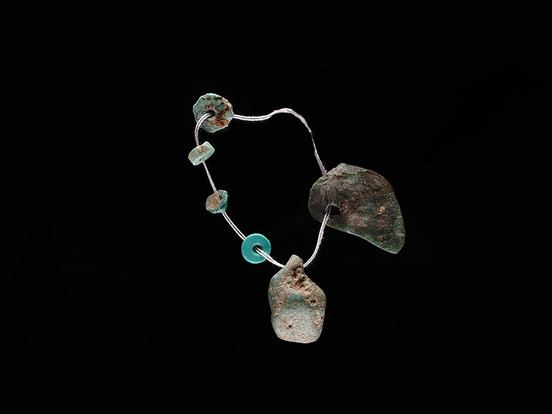 Conjunto de seis cuentas de diversos tamaños de turquesa, sin fecha. Colección Arqueológica Raúl Bahamondes. N° de inventario 3805. Fotografía: Romina Moncada.
