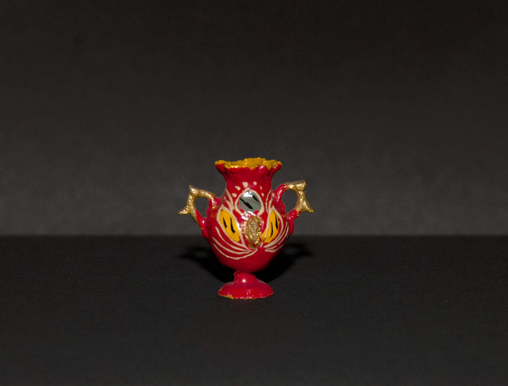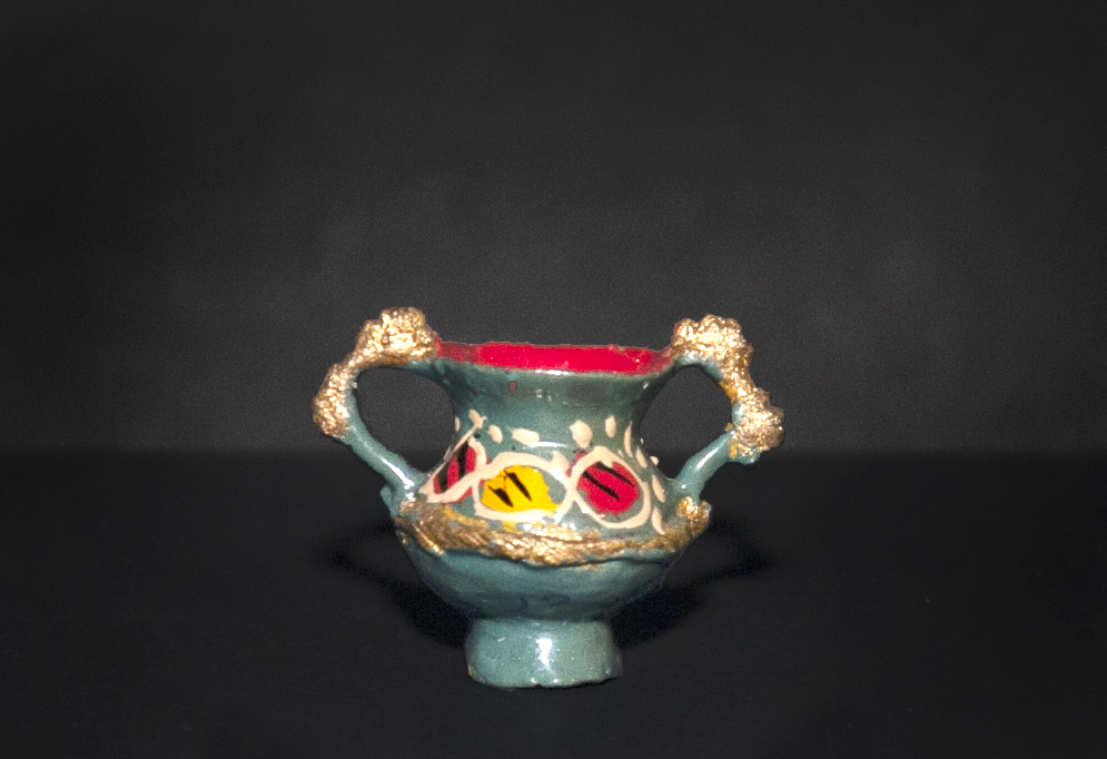 (Atribuida a) Sara Guitérrez. Vasija en miniatura con dos asas polilobuladas y borde ondeado. Primer tercio del siglo XX. Arcilla modelada, cocida, policromada y dorada. 24,05 x 24,37 x 15,21 mm. Colección de Artes Populares y Artesanías, Museo de Historia Natural de Valparaíso. N.º inv. 2397. Fotografía: Marisol Toledo.