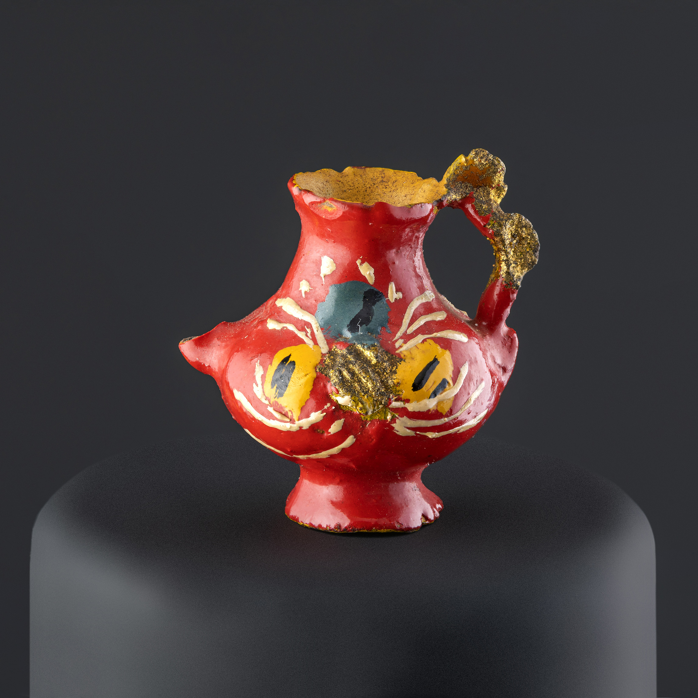(Atribuida a) Sara Guitérrez. Jarro en miniatura con asa polilobulada y dorada. Primer tercio del siglo XX. Arcilla modelada, cocida, policromada y dorada. 23,22 x 24,14 x 20,54 mm. Colección de Artes Populares y Artesanías, Museo de Historia Natural de Valparaíso. N.º inv. 2406. Fotografía: Juan Pablo Turén.