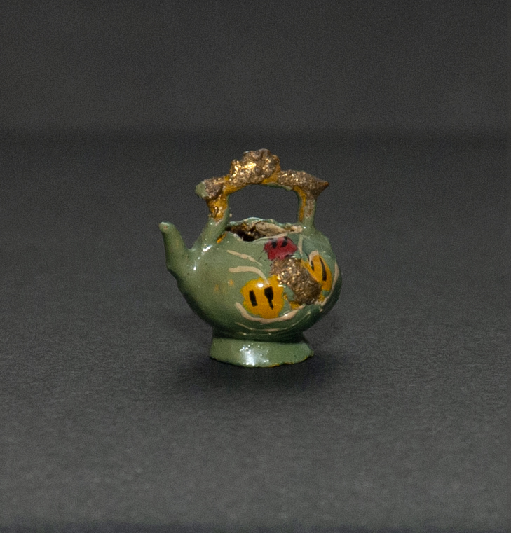 (Atribuida a) Sara Guitérrez. Mate en miniatura con fragmentos faltantes en pie y asas. Primer tercio del siglo XX. Arcilla modelada, cocida, policromada y dorada. 11,85 x 12,01 x 8,67 mm. Colección de Artes Populares y Artesanías, Museo de Historia Natural de Valparaíso. N.º inv. 2408. Fotografía: Marisol Toledo.