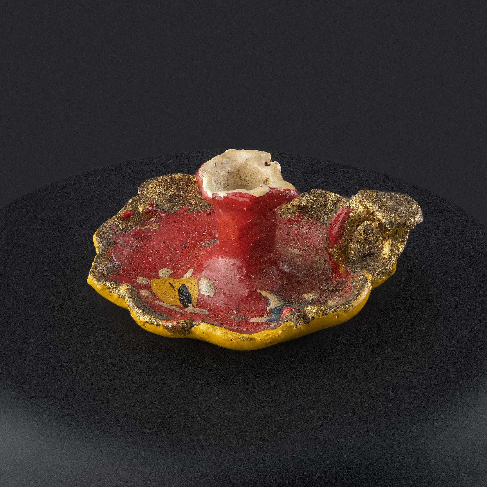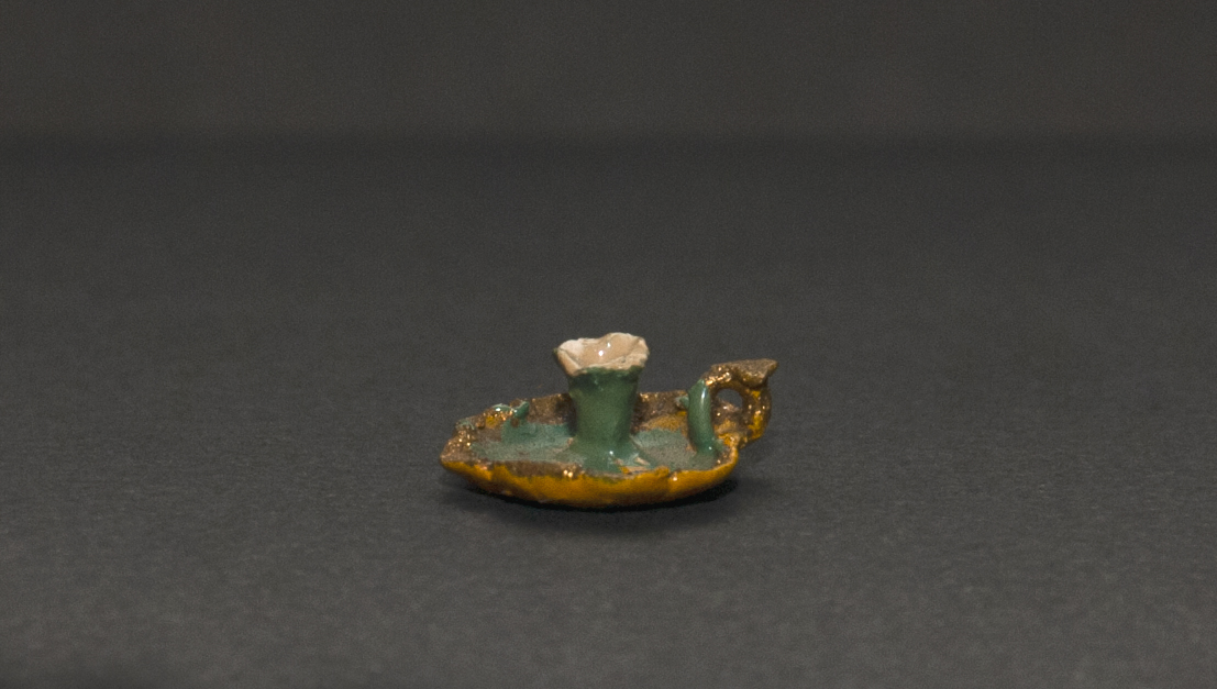 (Atribuida a) Sara Gutiérrez. Palmatoria en miniatura con asa dorada y bordes ondeados. Primer tercio del siglo XX. Arcilla modelada, cocida, policromada y dorada. 6,23 x 10 x 13,25 mm. Colección de Artes Populares y Artesanías, Museo de Historia Natural de Valparaíso. N.º inv. 2413. Fotografía: Juan Pablo Turén.