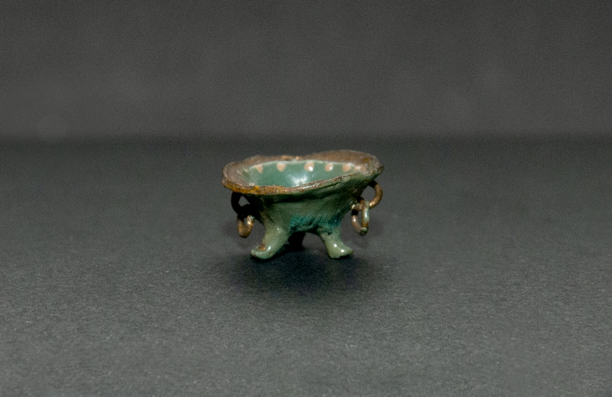 (Atribuida a) Sara Gutiérrez. Brasero en miniatura de tres patas, con asas laterales y argollas colgantes. Primer tercio del siglo XX. Arcilla modelada, cocida, policromada y dorada. 9,01 x 10 x 15,33 mm. Colección de Artes Populares y Artesanías, Museo de Historia Natural de Valparaíso. N.º inv. 2416. Fotografía: Marisol Toledo.