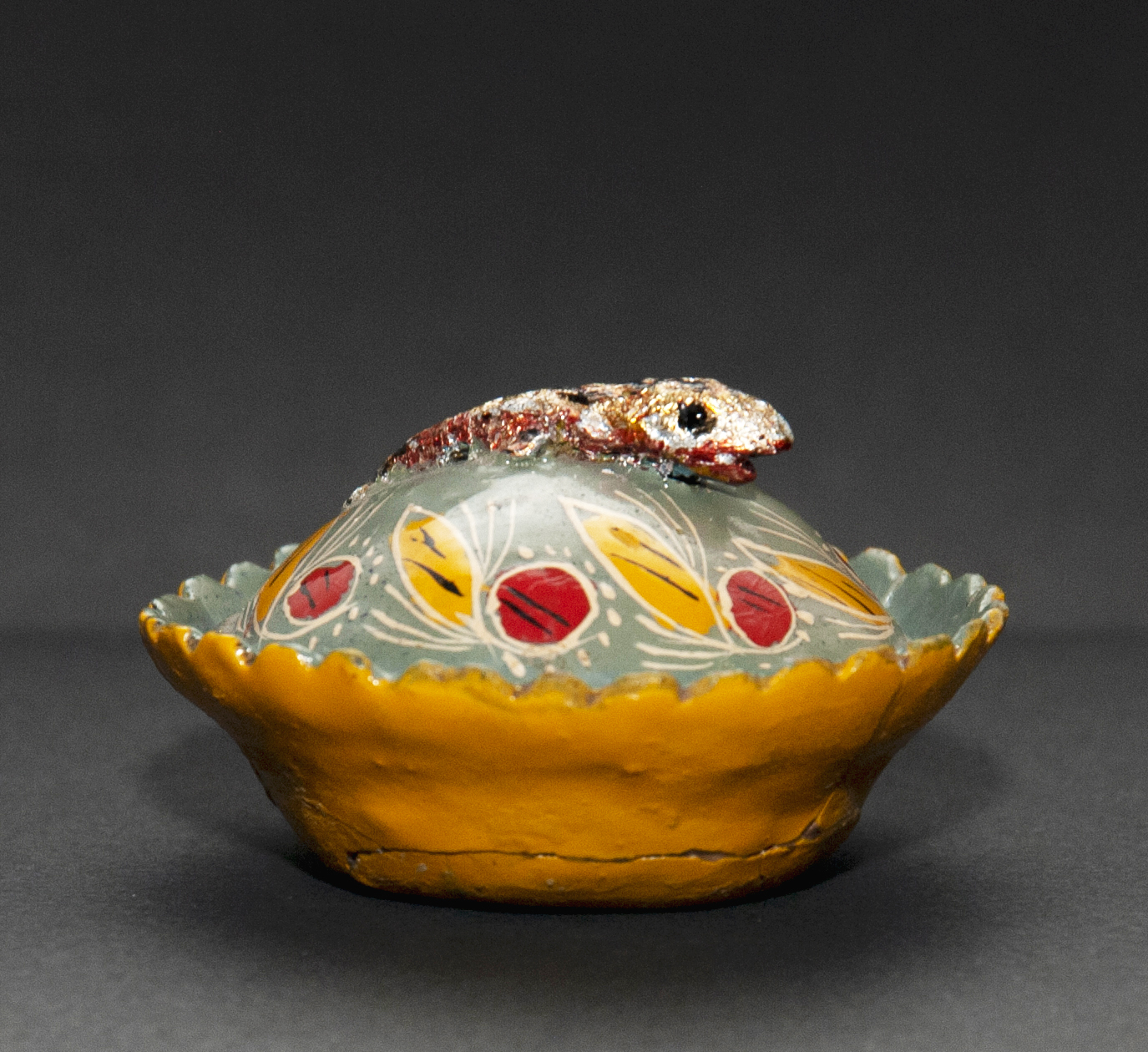 (Atribuida a) Sara Gutiérrez. Recipiente en miniatura para dulces, con borde ondeado y pez en relieve. Primer tercio del siglo XX. Arcilla modelada, cocida, policromada y dorada. 30 x 47,16 x 49,11 mm. Colección de Artes Populares y Artesanías, Museo de Historia Natural de Valparaíso. N.º inv. 2415. Fotografía: Marisol Toledo.