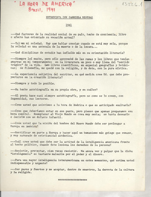 Entrevista con Gabriela Mistral [manuscrito] / Gabriela Mistral. 1 h. ; 27 cm. .