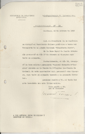 Circular N° 15, 1948 feb. 18, Santiago, [Chile] [a] Los Señores Jefes de Misión y Cónsules de Chile [manuscrito] / Manuel Trucco. 1 h. ; 33 cm. + anexos ([5] h. ; 33 cm.) .
