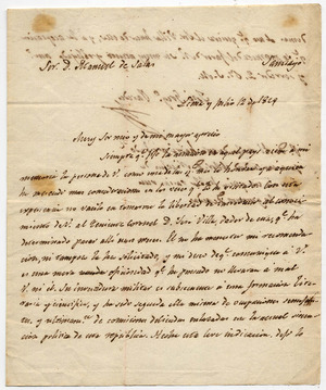 [Carta] 1829 Julio 12, Lima [al] Sor. D. Manuel de Salas [manuscrito] / José Grego[rio] Paredes. 2 h. ; 23 cm. .