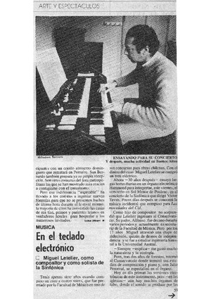 Música en el teclado electrónico Miguel Letelier, como compositor y como solista de la Sinfónica [artículo] Ercilla (Revista : Chile) jul. 20, 1977, p. 59. il. .
