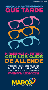 Mucho más temprano que tarde miraremos al futuro con los ojos de Allende [recurso electrónico] [Chile] : [Agencia de Mauricio Galaz], [2013]. 1 imagen : digital, formato JPEG, color .