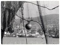 Vista del muelle y cerros de Valparaíso, desde una embarcación.