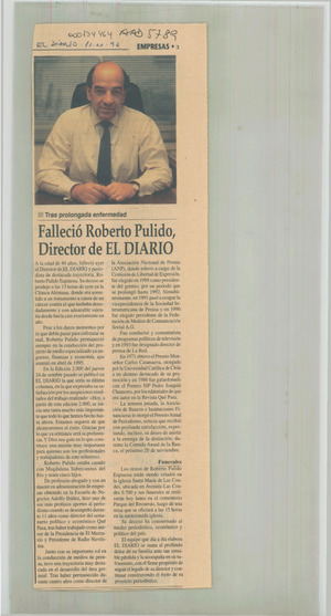 Falleció Roberto Pulido, Director de El Diario [artículo]. El Diario. -- nov. 11, 1996, p. 3 (suplemento) retr. .