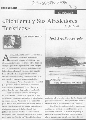 "Pichilemu y sus alrededores turísticos" [artículo] José Vargas Badilla La Región (San Fernando) ago. 24, 1999, p. 3 il. .