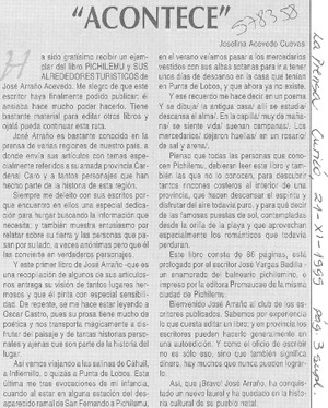 "Acontece" [artículo] Josefina Acevedo Cuevas La Prensa (Curicó) nov. 21, 1999, p. 3 (suplemento) .