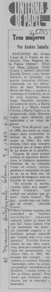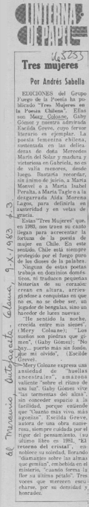 Tres mujeres [artículo] / Andrés Sabella. El Mercurio (Diario : Antofagasta, Chile)-- oct. 9, 1983, p. 3. El Mercurio (Diario : Calama, Chile)-- oct. 9, 1983, p. 3. .