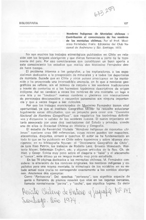 Nombres índigenas de montañas chilenas y contribución al conocimiento de los hombres de las montañas [artículo] / Humberto Barrera V. Revista Chilena de Historia y Geografía (Santiago, Chile)-- no. 142 (1974) p. 187-189. .
