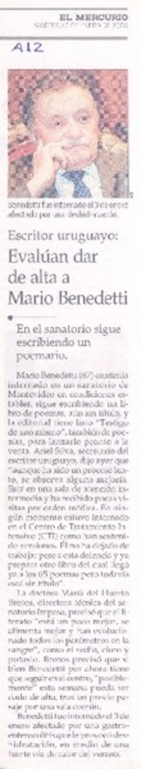 Evalúan dar de alta a Mario Benedetti [artículo] / El Mercurio (Diario : Santiago, Chile)-- ene. 22, 2008, p. A12. .