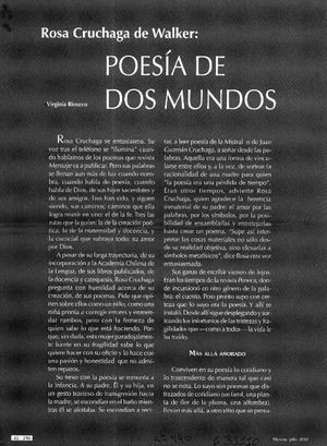 Poesía de dos mundos [artículo] Virginia Rioseco Mensaje (Santiago) no. 490 (jul. 2000) p. 42-43 .