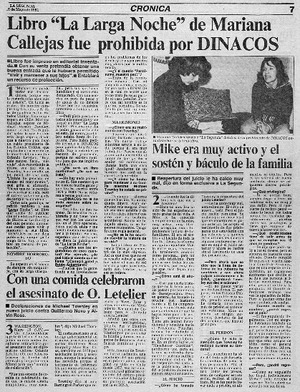 Libro "La larga noche" de Mariana Callejas fue prohibida por DINACOS : [Entrevista] [artículo] La Segunda (Diario : Santiago, Chile)-- mayo 5, 1981, p. 7. retr. .