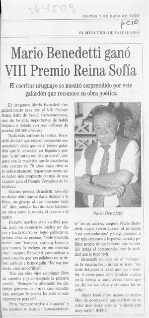 Mario Benedetti ganó VIII Premio Reina Sofía [artículo] El Mercurio, Valpo. Jun. 1, 1999, p.C10 retr. .