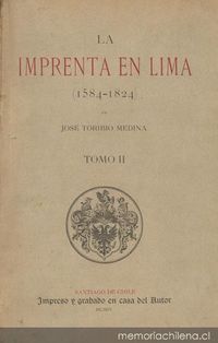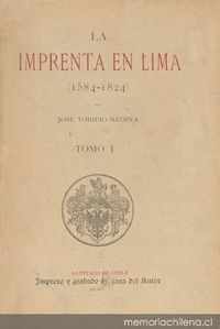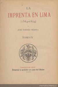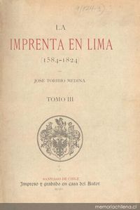La Imprenta en Lima : (1584-1824) / por José Toribio Medina. Santiago : Impreso y grabado en casa del Autor, 1904-1907. 4 volúmenes : facsímilares, viñetas ; 29 cm. .